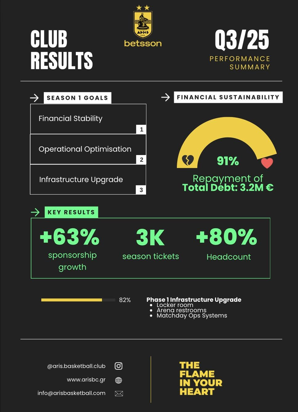 Από το συνολικό χρέος των 3.2 εκατομμυρίων ευρώ ο Άρης Betsson μετά το τρίτο τρίμηνο του 2025 έχει αποπληρώσει μέσα σε μερικούς μήνες το 91% του ποσού αυτού, ενώ παράλληλα τρέχει μια σειρά από διεργασίες για την αναβάθμιση όλου του συλλόγου.