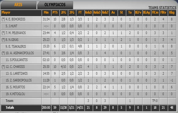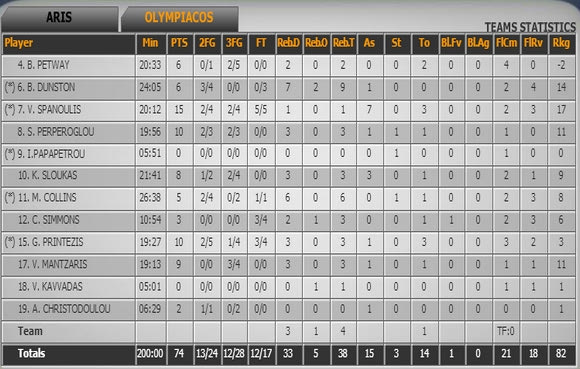 Ολυμπιακός (Μπαρτζώκας):Πέτγουεϊ, Ντάνστον 6, Σπανούλης 15 (2τριπ, 7ασ), Περπέρογλου 10 (2), Παπαπέτρου, Σλούκας 5 (1), Κόλινς 2 (6ριμπ), Σίμονς 2, Πρίντεζης 10 (1), Μάντζαρης 9 (3), Καββαδάς.