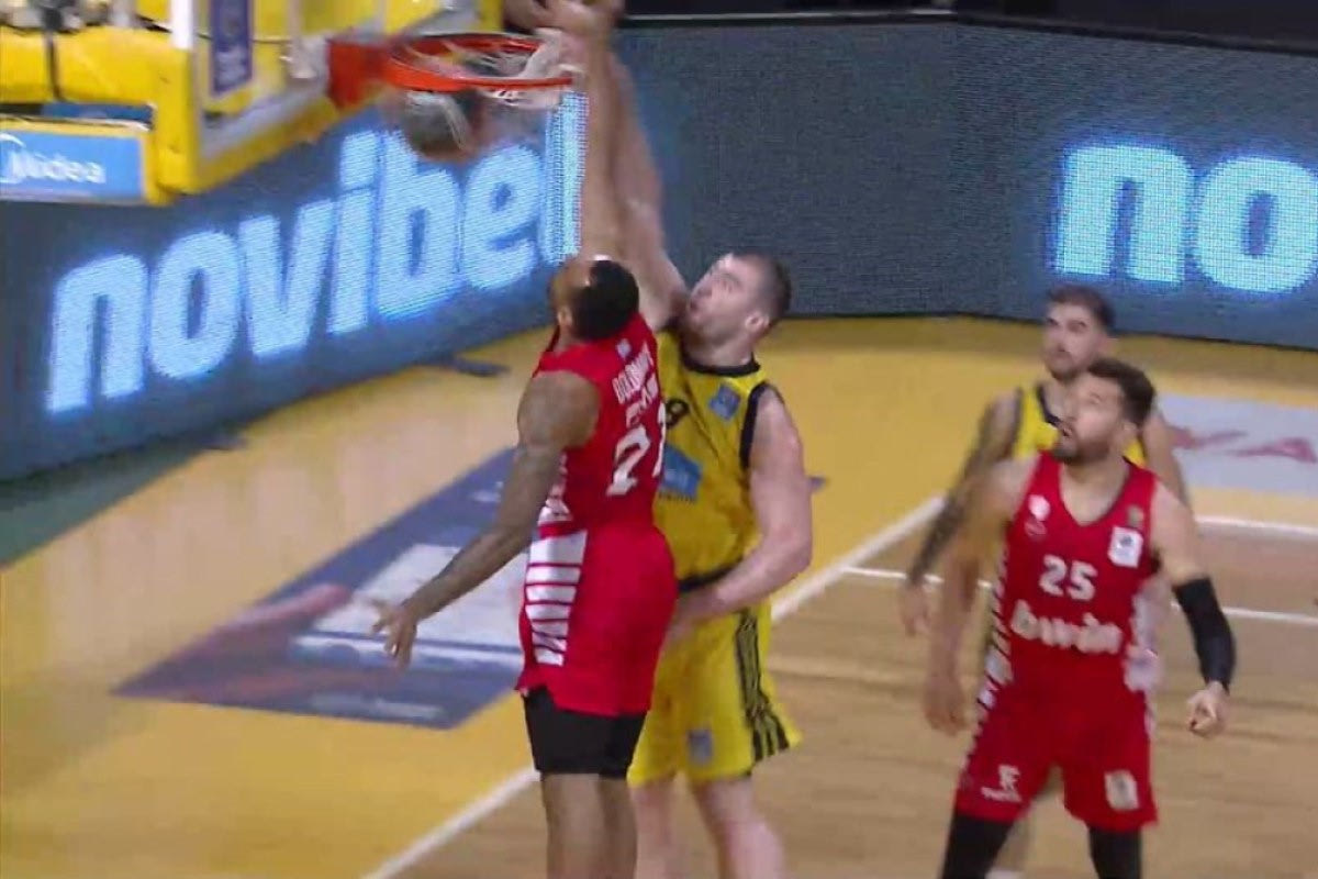Τρομερό poster κάρφωμα μπροστά στον Τζοέλ Μπόλομποϊ πέτυχε ο Βασίλης Καββαδάς στο Game 2 του Άρη με τον Ολυμπιακό στα playoffs της Basket League.