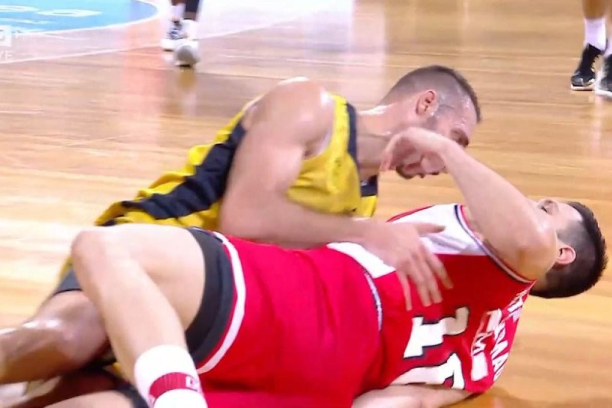 Σε “τάκλιν” εξελίχθηκε ένα μπλονζόν του Διαμαντή Σλαφτσάκη, που προσπάθησε να κλέψει την μπάλα από τα χέρια του Κώστα Παπανικολάου και…γκρέμισε στο παρκέ τον αρχηγό του Ολυμπιακού.