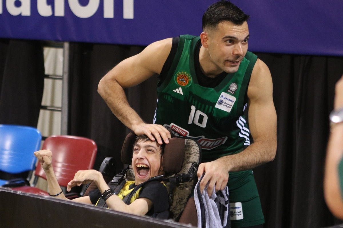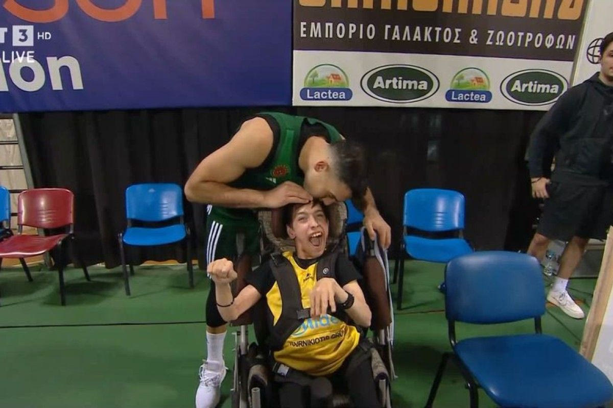 Πριν κατευθυνθεί προς τα αποδυτήρια του Nick Galis Hall, ο Κώστας Σλούκας φίλησε έναν φίλο του Άρη σε αναπηρικό αμαξίδιο, με αμφότερους να χαμογελούν μπροστά στον φωτογραφικό φακό.