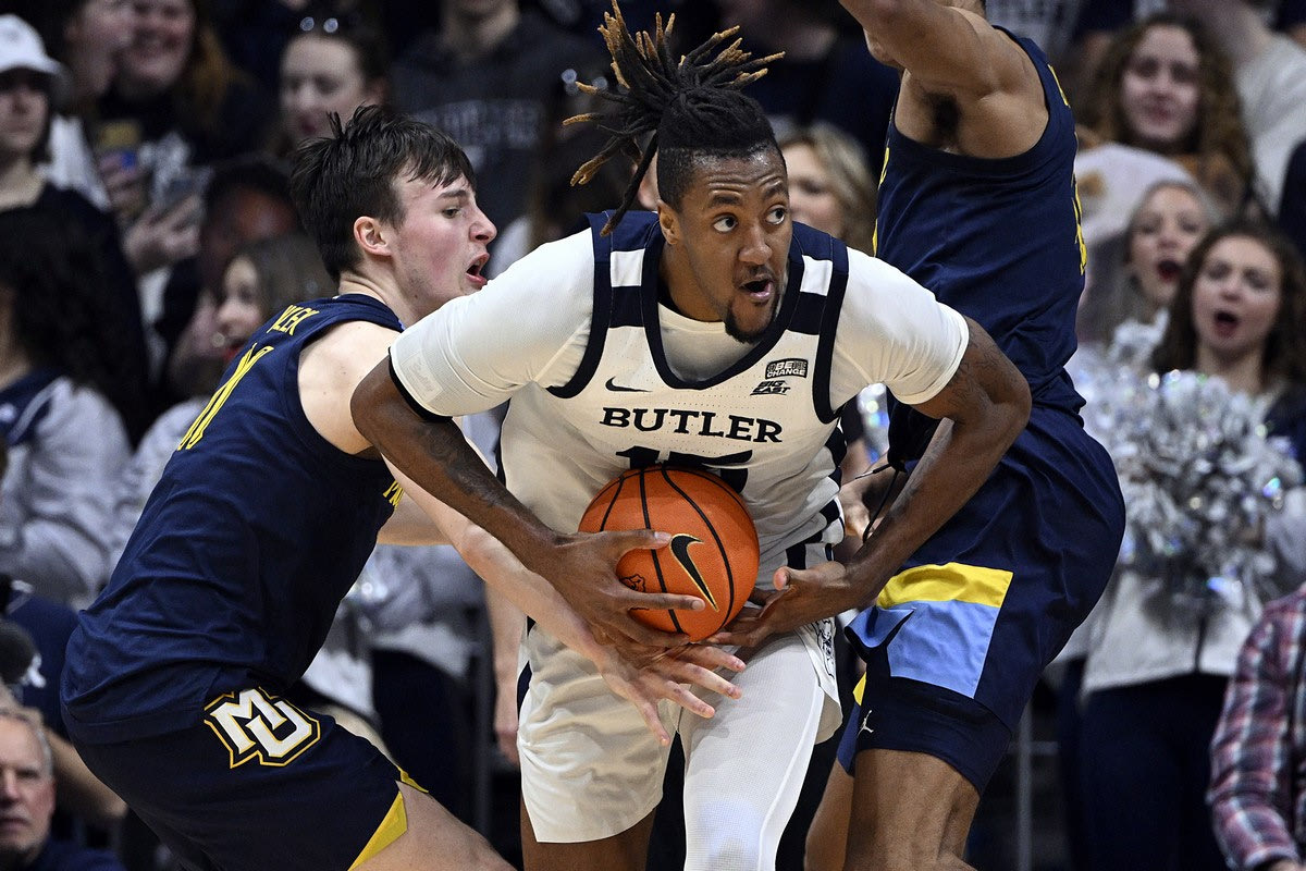 Marquette guard Tyler Kolek (11) gets his hand on a ball under the control of Butler center Manny Bates (15) iduring the second half of an NCAA basketball game, Tuesday, Feb. 28, 2023, in Indianapolis. (AP Photo/Marc Lebryk)