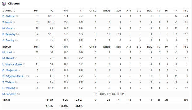 Για τους Κλίπερς, ο Τομπάιας Χάρις είχε 26 πόντους, ο Ντανίλο Γκαλινάρι 24 πόντους και ο Λου Ουίλιαμς 17 πόντους.