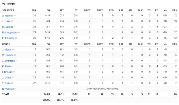 Για τους Μάτζικ, ο Ντι Τζέι Όγκαστιν είχε 17 πόντους, με τον Άαρον Γκόρντον να προσθέτει 12 πόντους, 9 ριμπάουντ και 7 ασίστ και τον Εβάν Φουρνιέ 12 πόντους, αλλά με 5/15 σουτ.
