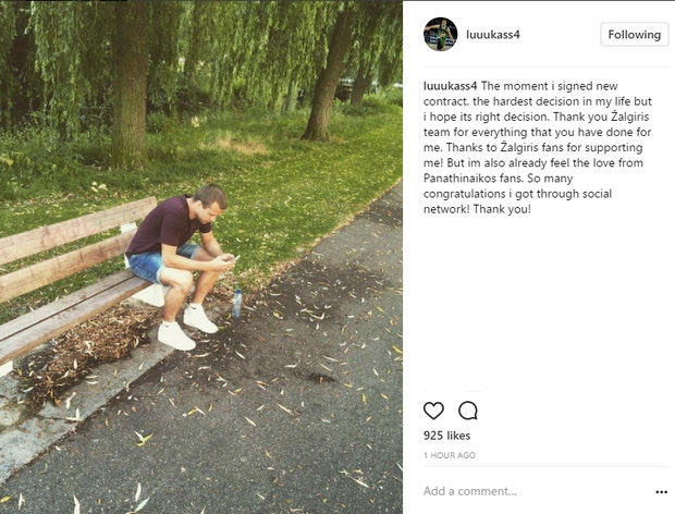 Λίγη ώρα αφότου ο Παναθηναϊκός Superfoods ανακοίνωσε την απόκτησή του , ο Λούκας Λεκαβίτσιους αποχαιρέτησε τους φίλους της Ζάλγκιρις μέσω του προσωπικού του λογαριασμού στο Instagram. Ο 23χρονος πλεϊμέικερ “ανέβασε” μια φωτογραφία που απεικονίζει την στιγμή που απαντάει θετικά στην πρόταση του “τριφυλλιού”, εξηγώντας πως ήδη νιώθει την αγάπη των φιλάθλων της ελληνικής ομάδας.