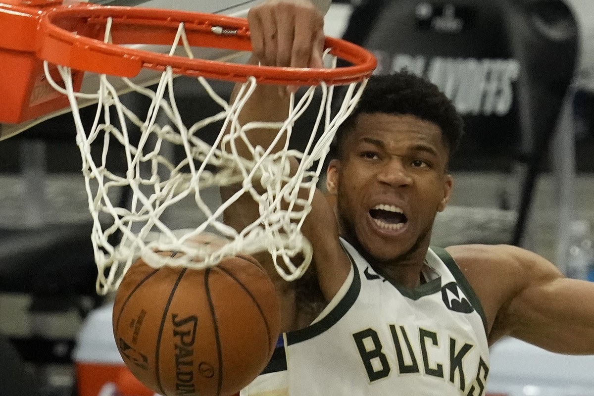 Ο Γιάννης Αντετοκούνμπο καρφώνει στο καλάθι των Νετς, στο Game 4 της ημιτελικής σειράς της Ανατολής (13/6/2021) 2021 AP Photo/Morry Gash