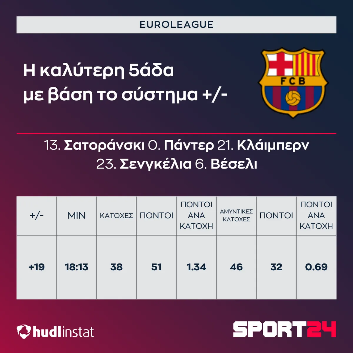 Κόντρα στον Ολυμπιακό, οι δύο Αμερικανοί έκαναν απίστευτα πράγματα, ενώ οι Σενγκέλια-Βέσελι-Σατοράνσκι έδωσαν όλοι πράγματα. Αποτέλεσμα ήταν η βασική πεντάδα των Καταλανών πρακτικά να καθαρίσει το παιχνίδι, βγάζοντας το απίστευτο +19 στο σύστημα +/-. Για να υπάρξει αντίστοιχη σύγκριση, η βασική πεντάδα του Ολυμπιακού (Γουόκαπ, Ντόρσεϊ, Φουρνιέ, Βεζένκοβ, Μιλουτίνοβ) είχε -15.
