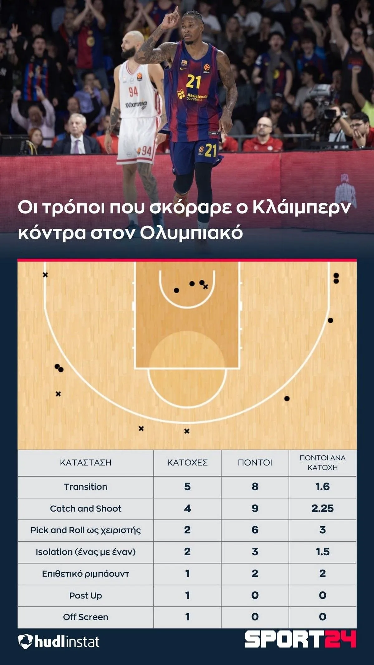 Μπαρτσελόνα – Ολυμπιακός: Το δίδυμο Πάντερ-Κλάιμπερν, το Pick and Pop του Βέσελι και το +19 της βασικής πεντάδας των Καταλανών