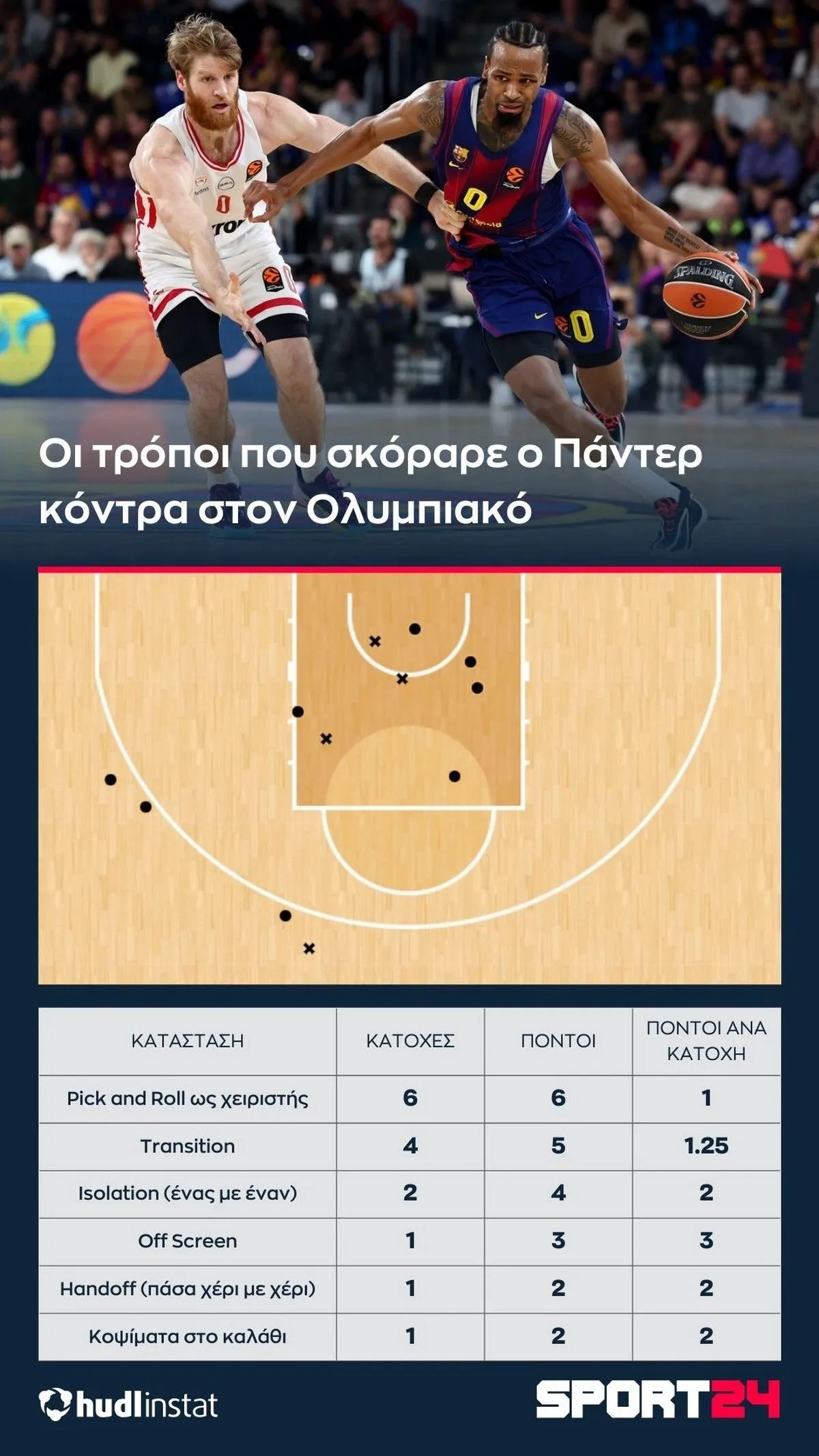 *Με κυκλάκι τα εύστοχα σουτ, με “x” τα άστοχαΟ Πάντερ στο πρώτο μέρος βρήκε πόντους κυρίως στο transition, ωστόσο στην 3η περίοδο πήρε πρωτοβουλίες σε κατάσταση Pick and Roll. Κάτι που οδηγεί στο play που έφερε το ξέσπασμα της Μπαρτσελόνα.