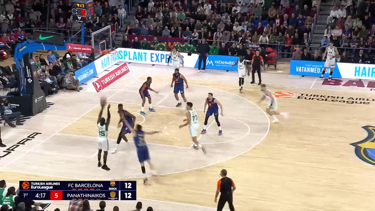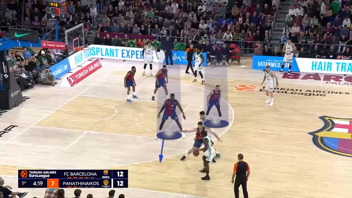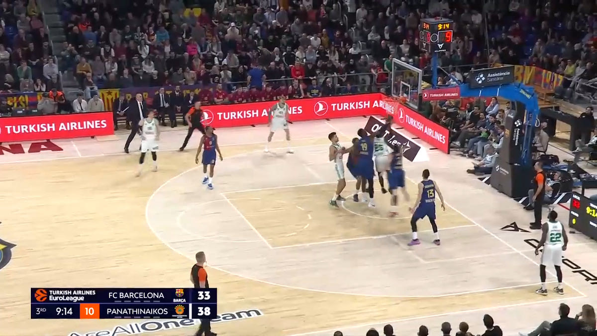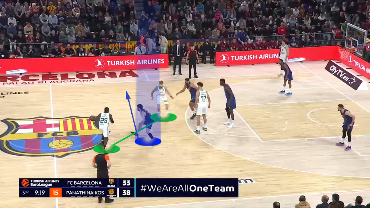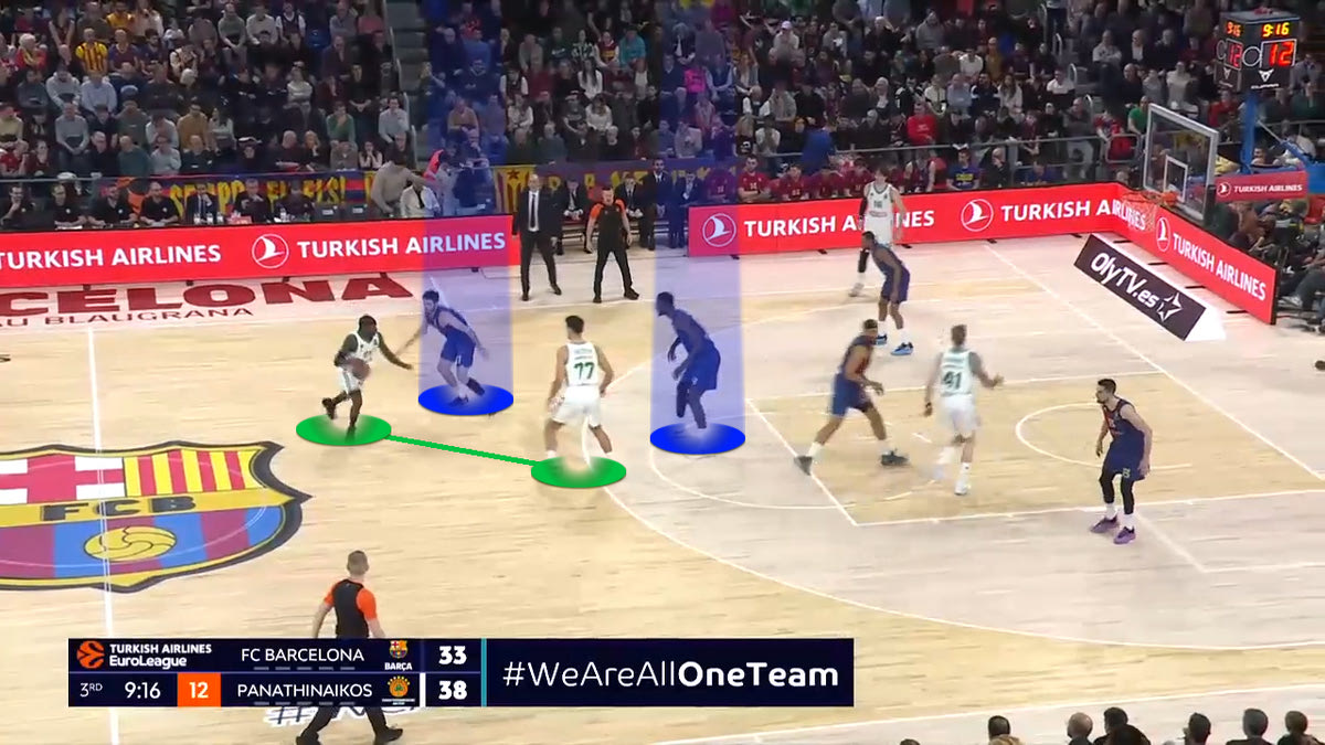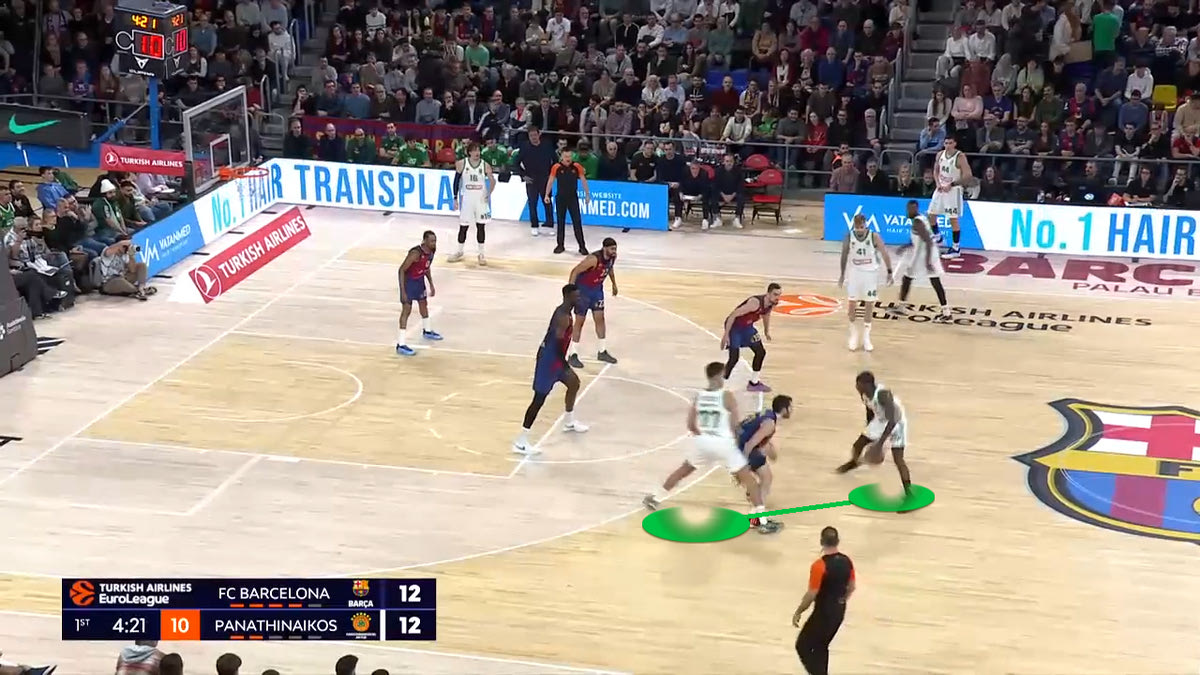 Ο Ναν θέλει να στήσει Pick and Roll με τον Γιούρτσεβεν. Ο Αμπρίνες τον στέλνει στο δεξί του χέρι, ενώ όλη η Μπαρτσελόνα είναι έτοιμη να βοηθήσει. Ο Γιούρτσεβεν αλλάζει γωνία σκριν, και ο Ναν πάει προς τα αριστερά.