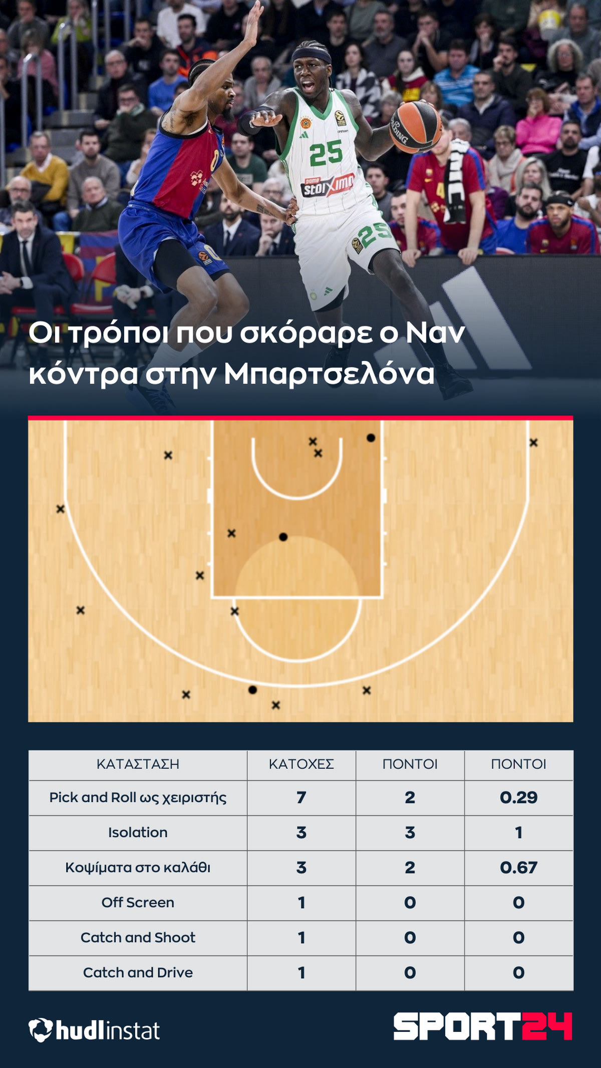 Σύμφωνα με το Hudl Instat, ο Ναν έκανε τα 2 από τα 5 λάθη του σε κατάσταση Pick and Roll. Συνολικά οι Καταλανοί υποχρέωσαν τους “πράσινους” σε 4 λάθη σε κατάσταση Pick and Roll. Είναι σαφές ότι δεν ευθυνόταν μόνο η άμυνα των Καταλανών για την άσχημη βραδιά του Ναν. Υπήρξαν σουτ που πήρε ο Αμερικανός σούπερ σκόρερ και αστόχησε, στα οποία συνήθως ευστοχεί. Το πλάνο των “μπλαουγκράνα” όμως ήταν σωστό.