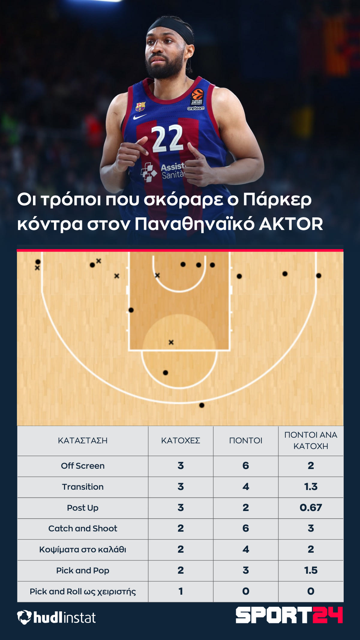 Με κυκλάκι τα εύστοχα σουτ, με “x” τα άστοχα