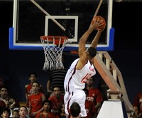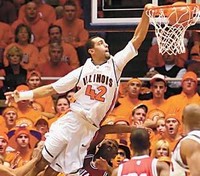 Forward Brian Randle soars for a dunk against Indiana on Sunday. The Illini won, 70-58.”>