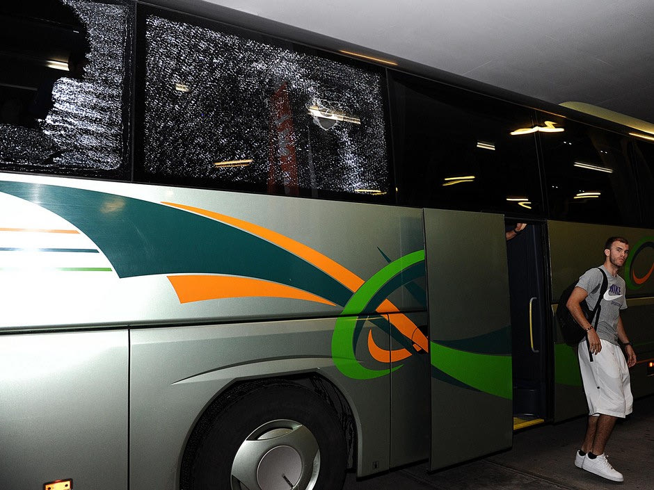 «Η πρώτη πέτρα έσπασε το τζάμι και τραυμάτισε τον Στίβεν, ο οποίος μπορώ να πω ότι ήταν και τυχερός, γιατί συνήθως κάθεται με το κεφάλι κολλημένο στο παράθυρο, αλλά έτυχε να το μετακινήσει δέκα δευτερόλεπτα νωρίτερα. Σκέψου να ήταν το κεφάλι του στο τζάμι. Θα τραυματιζόταν πολύ χειρότερα. Όπως και ο Αλβέρτης, ο οποίος βρισκόταν δύο θέσεις πίσω από τον Σμιθ και αν η δεύτερη κοτρόνα διαπερνούσε κι αυτή το τζάμι, θα είχε χτυπήσει πολύ άσχημα. Δυστυχώς, δεν τη γλίτωσε ο Στράτος, που καθόταν στην ίδια ευθεία με τον Σμιθ, με αποτέλεσμα να καταλήξει και αυτός στο νοσοκομείο», μας είπε ο Μπατίστ, ο οποίος περπατούσε νευρικός έξω από τα αποδυτήρια του Παναθηναϊκού στο ΣΕΦ.