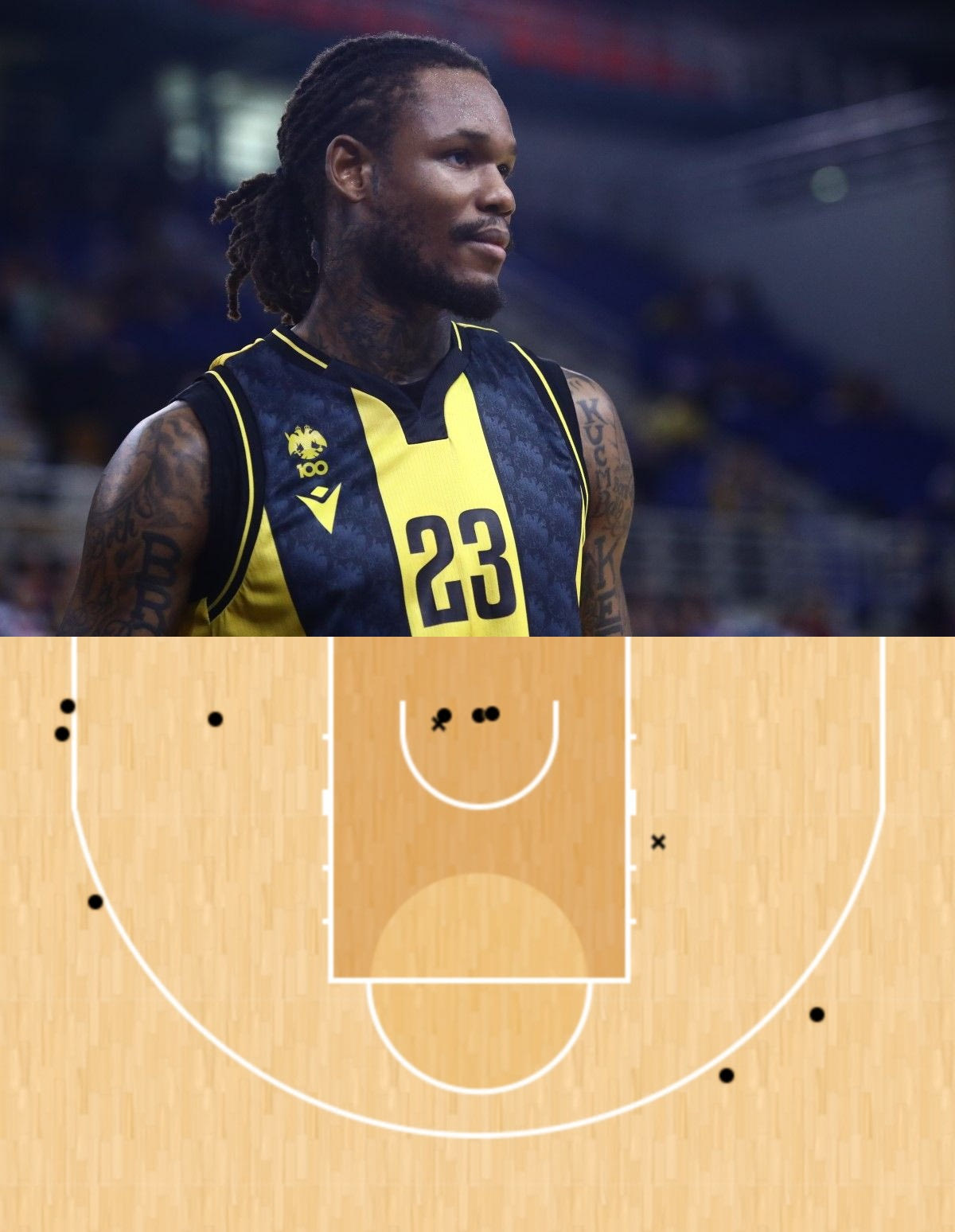 Ο ΜάκΛεμορ ήταν ζεστός από την αρχή. Σκόραρε όπως και όποτε ήθελε. Το τέλος της βραδιάς τον βρήκε να έχει 26 πόντους με 4/6 δίποντα, 5/5 τρίποντα, 3/4 βολές, 4 ριμπάουντ και +26 στο σύστημα +/- σε 17 (!) λεπτά συμμετοχής. Κοινώς, σκόραρε 1.5 πόντο κάθε λεπτό που βρέθηκε στο παρκέ (!), ενώ – σύμφωνα με το Hudl Instat – σημείωνε 2.04 πόντους ανά κατοχή, σε ένα μυθικό νούμερο. Ιδού και το Shot Chart του.