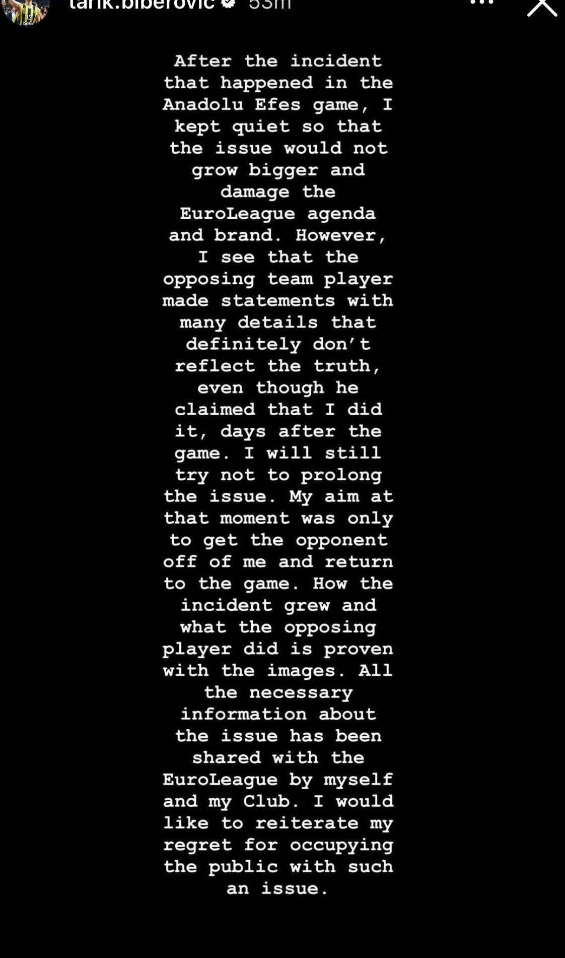 Ο στόχος εκείνη τη στιγμή ήταν να διώξω τον αντίπαλο από πάνω μου και να επιστρέψω στο ματς. Το πώς το περιστατικό γιγαντώθηκε και αυτό που συνέβη αποδεικνύεται από τις φωτογραφίες. Όλες οι απαραίτητες πληροφορίες σχετικά με το ζήτημα έχουν κοινοποιηθεί στη EuroLeague, τόσο από εμένα, όσο και από την ομάδα. Θα ήθελα να γίνει σαφές πως μετανιώνω που απασχόλησα το κοινό με ένα τέτοιο ζήτημα”.
