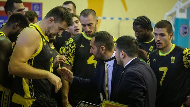 Οι παίκτες του Άρη σε τάιμ-άουτ στον αγώνα με το Μεσολόγγι για την Basket League