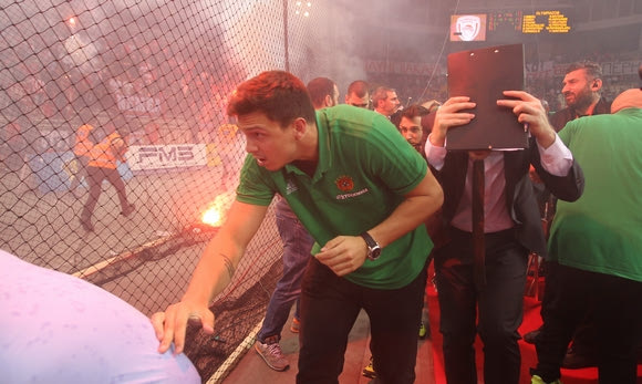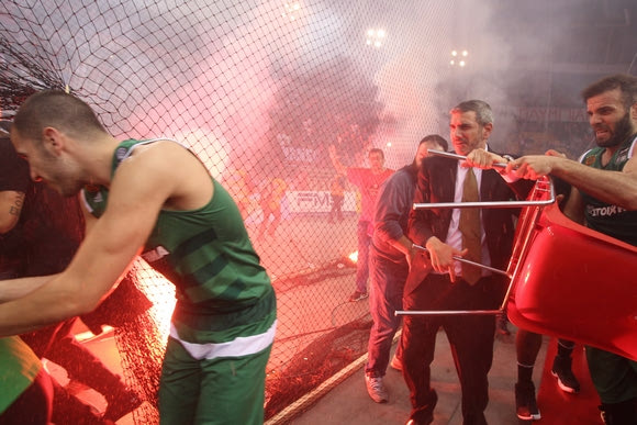 Παίκτες, προπονητές και διαιτητές πήγαν στα αποδυτήρια, με τους ανθρώπους του Ολυμπιακού να προσπαθούν να ρίξουν τους τόνους για να ολοκληρωθεί το παιχνίδι. Αυτό λίγα μόλις λεπτά με την αποχώρηση του Δημήτρη Γιαννακόπουλου που δέχθηκε αντικείμενα και για λόγους ασφαλείας έφυγε από τη θέση του δίπλα στον πάγκο.