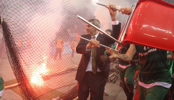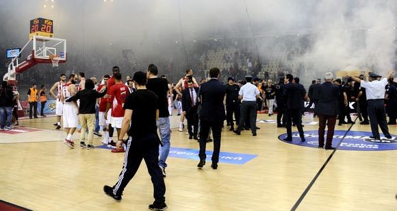 1:56 πριν το τέλος του πέμπτου τελικού της Stoiximan.gr Basket League, οι διαιτητές διέκοψαν την αναμέτρηση εξαιτίας αντικειμένων, βεγγαλικών και κροτίδων που έπεσαν στον αγωνιστικό χώρο (VIDEO).