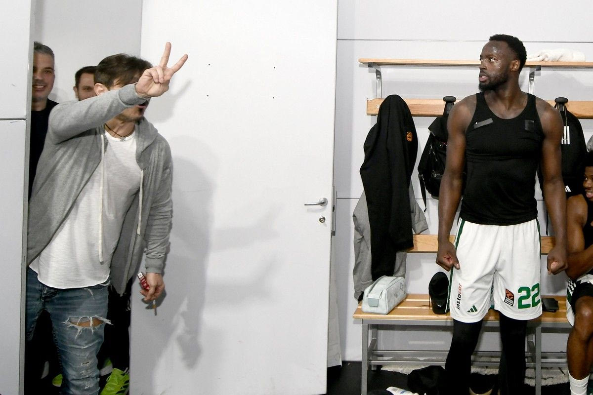 Στιγμές μετά από το φινάλε του αγώνα με τη Βίρτους Μπολόνια και τη νίκη στο “μηδέν” χάρη στο buzzer beater του Κέντρικ Ναν, ο Δημήτρης Γιαννακόπουλος βρέθηκε στα αποδυτήρια του Παναθηναϊκού AKTOR για να συγχαρεί τους παίκτες για τη μεγάλη νίκη στη Virtus Segafredo Arena.