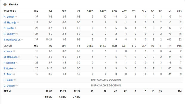 Για τους Νικς, ο Τιμ Χάρνταγουεϊ είχε 32 πόντους, με τον Τρέι Μπερκ να προσθέτει 19 πόντους, τον Εμάνουελ Μουντιαϊ 16 πόντους και τον Νοά Βονλέ 14 πόντους και 14 ριμπάουντ.