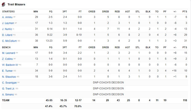 Οι δύο γκαρντ των Μπλέιζερς έκαναν ό,τι ήθελαν κόντρα στην άμυνα των Νεοϋορκέζων, με τον ΜακΚόλουμ να ολοκληρώνει τον αγώνα με 31 πόντους και τον Λίλαρντ να προσθέτει 29 πόντους. Άξιοι συμπαραστάτες τους ήταν ο Μέγερς Λέοναρντ με 15 πόντους και ο Γιουσούφ Νούρκιτς με 13 πόντους και 11 ριμπάουντ.