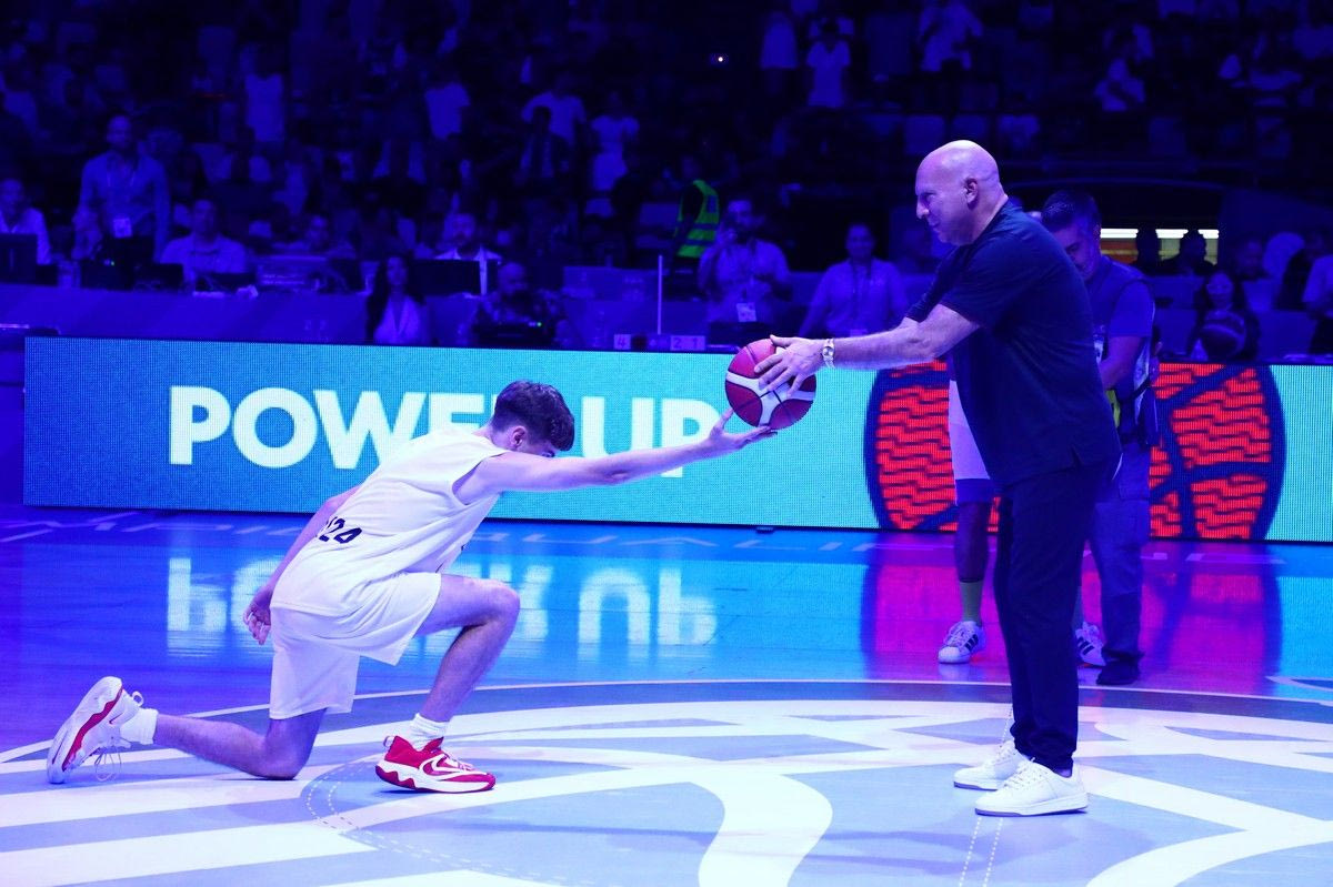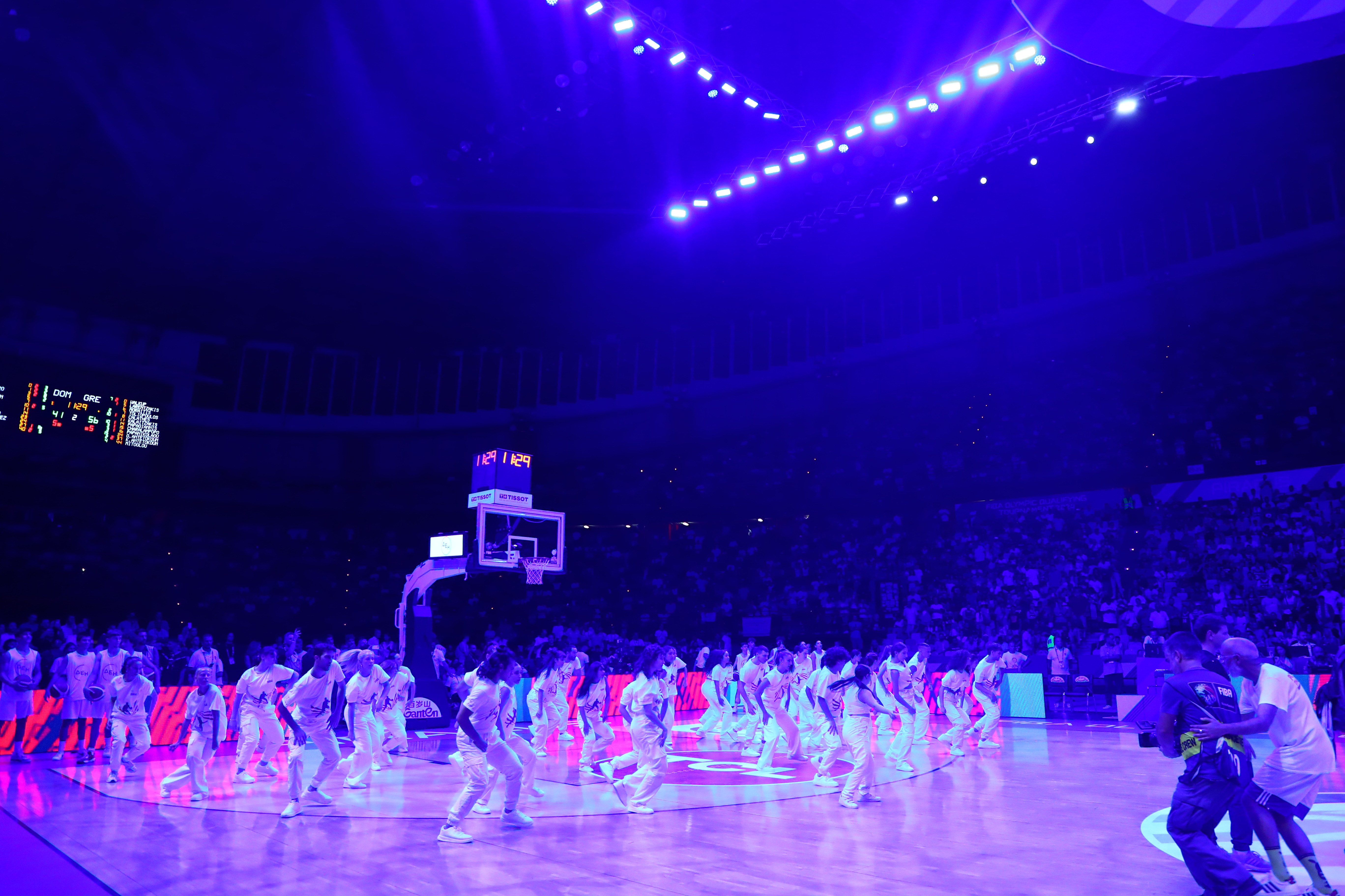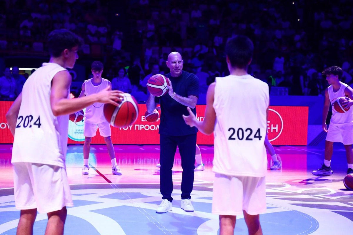 Ο θρύλος του ελληνικού μπάσκετ δέσποζε στο κέντρο του γηπέδου, με μια απίθανη χορογραφία να εξελίσσεται γύρω του η οποία περιλάμβανε εντυπωσιακό παιχνίδι με τα φώτα, μπάλες μπάσκετ και εκκωφαντική μουσική, με τον κόσμο να απολαμβάνει στο έπακρο το εντυπωσιακό τελετουργικό. Φυσικά, όλα αυτά υπό τους ήχους του “The Final Countdown”, του τραγουδιού ύμνου της θρυλικής ομάδας του 1987, που κατέκτησε το Eurobasket στο ίδιο παρκέ.