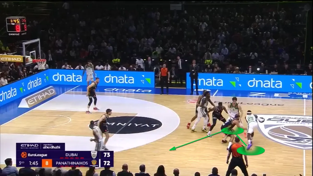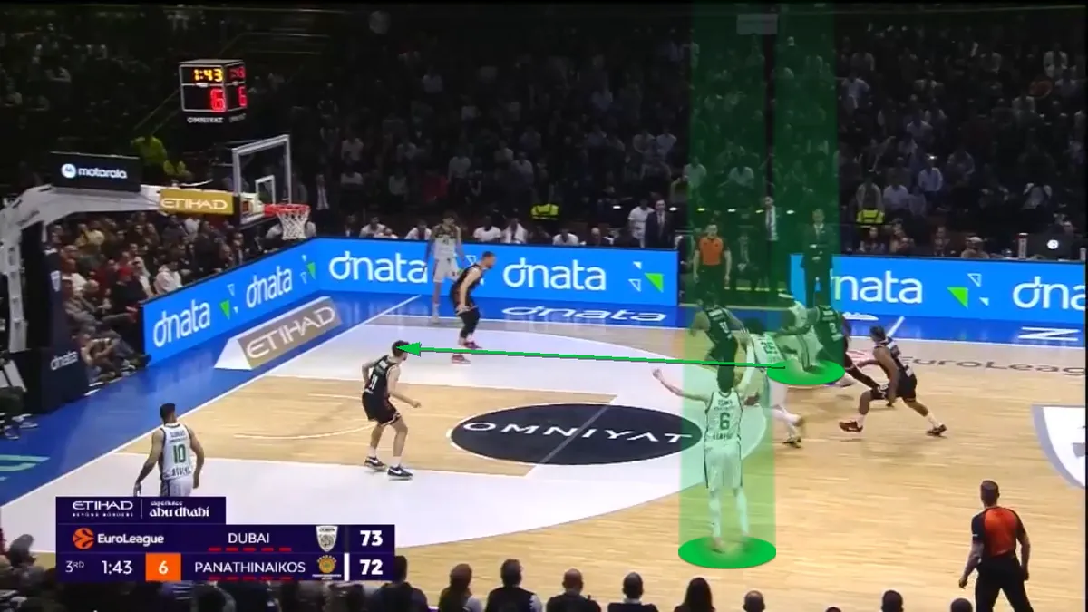Πολύς κόσμος πιθανόν να περίμενε ότι αυτό το σχήμα θα ξεκινούσε την δουλειά του από την άμυνα. Με τις δύο ομάδες ωστόσο να σκοράρουν εύκολα, πρακτικά αυτή η “πράσινη” πεντάδα έφερε σε άβολη θέση την Dubai BC στην άλλη πλευρά του παρκέ. Ο λόγος ήταν ότι σκόραρε με μεγάλη άνεση, παίζοντας “5 out” (με παίκτες στην περιφέρεια) χάρη στην παρουσία του Ντίνου Μήτογλου σε θέση σέντερ,με τον διεθνή σέντερ να ευστοχεί μάλιστα σε δύο τρίποντα.
