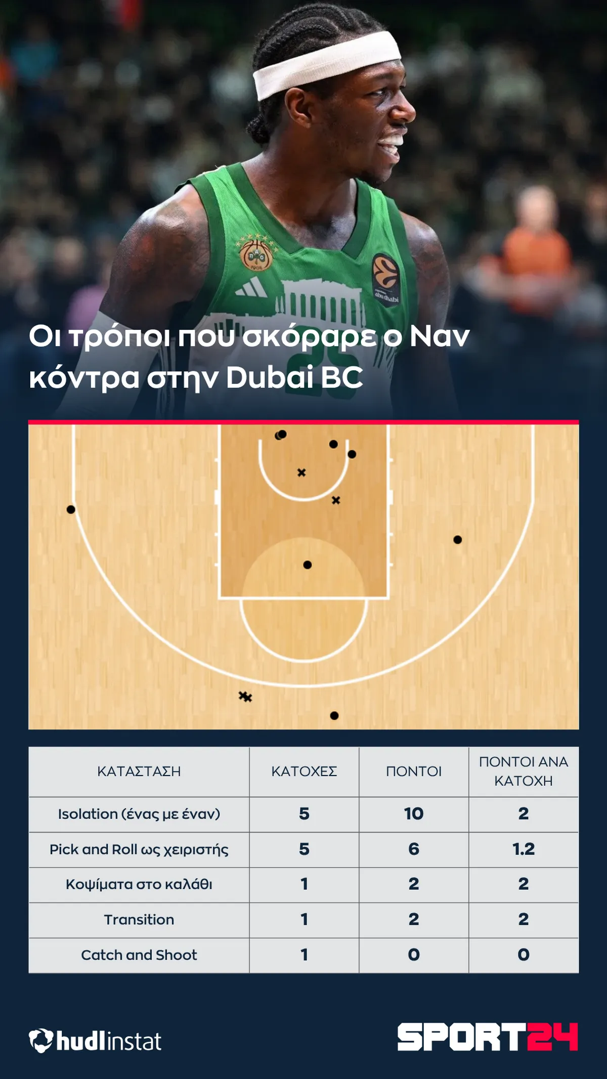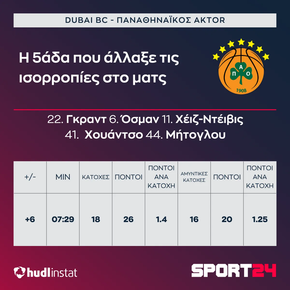 Ο Στέφανος Μακρής αναλύει με την βοήθεια του Hudl Instat την νίκη του Παναθηναϊκού AKTOR επί της Dubai BC. Η ψηλή πεντάδα που άλλαξε τα δεδομένα, το play με τον Όσμαν που δημιούργησε καταστάσεις και η κλάση των Ναν και Χέιζ-Ντέιβις στο φινάλε.