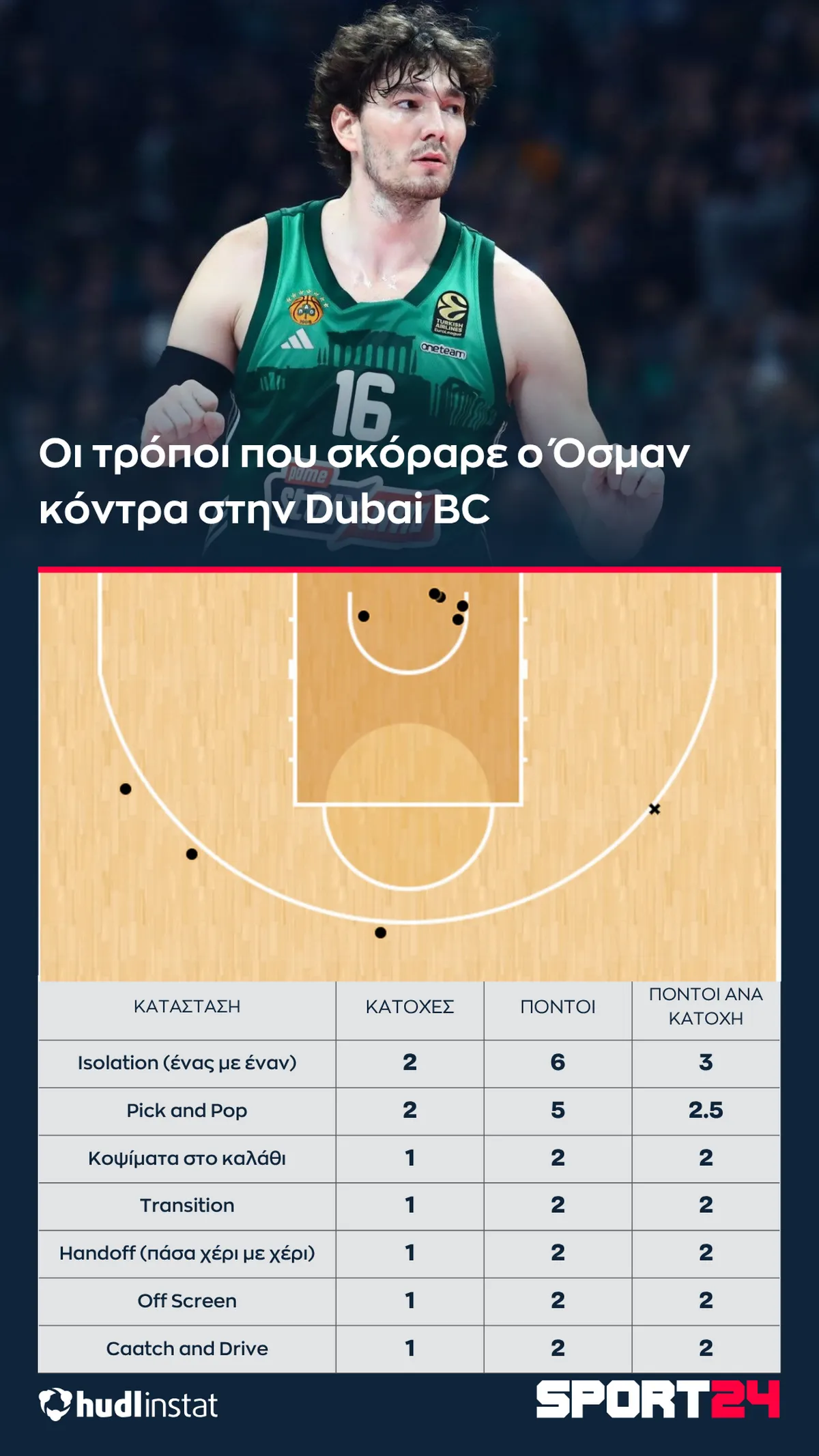 *Με κυκλάκι τα εύστοχα σουτ, με “x” τα άστοχαΟ Όσμαν σκόραρε με πολλούς τρόπους. Ένας από αυτούς ήταν σε κατάσταση Pick and Pop (όπου έκανε σκριν και μετά έβγαινε στο τρίποντο), αν και συχνά έπαιρνε Flare Screen (μετάφραση: Έδινε σκριν και μετά έπαιρνε παράλληλο σκριν βγαίνοντας στο τρίποντο). Ιδού ένα παράδειγμα:
