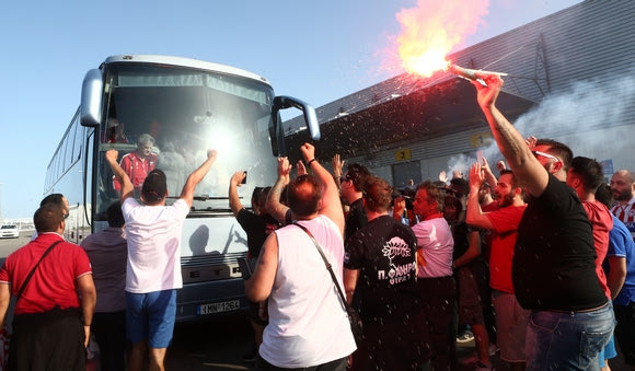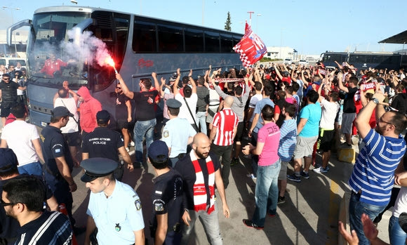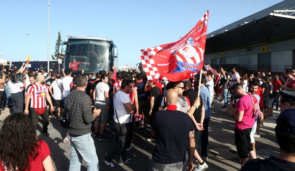 Το “παρών” στο αεροδρόμιο “Ελ. Βενιζέλος” έδωσαν περίπου 150 φίλοι των “ερυθρολεύκων”, οι οποίοι αψήφισαν την ήττα και την υψηλή θερμοκρασία, προκειμένου να χειροκροτήσουν τους παίκτες της ομάδας τους για την προσπάθειά τους.