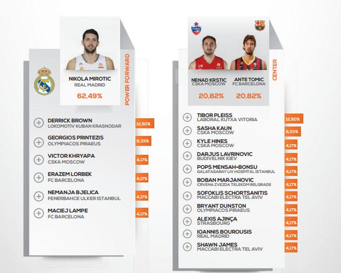 Στην κατηγορία του ανερχόμενου αστεριού (ή κατά τη Euroleague σε αυτή του Rising Star), οι ειδικοί εκτίμησαν πως το βραβείο θα καταλήξει στα χέρια του ” next best thing” της Σερβίας., ενώ στους καλύτερους υπάρχει και ένας Έλληνας Αναλυτικά, τα ποσοστά ήταν τα εξής.