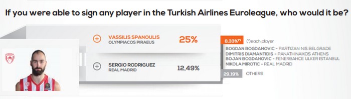 Μια στιγμή. Δεν τελειώσαμε. Ο Βασίλης Σπανούλης είναι ο παίκτης που θα επέλεγε το 25% των τζένεραλ μάνατζερ, αν μπορούσε να υπογράψει οποιονδήποτε για την ομάδα του. Ο Ροντρίγκεθ ακολούθησε με 12.49%, από 8.33% έλαβαν οι Μπόγκνταν Μπογκντάνοβιτς, Διαμαντίδης, Μπόγιαν Μπογκντάνοβιτς και Μίροτιτς και 29.19% ήταν το ποσοστό που συγκέντρωσαν άλλες περιπτώσεις.