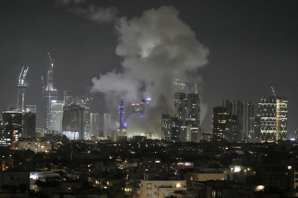 Στον ουρανό του Τελ Αβίβ διακρίνεται ένα πυκνό νέφος καπνού μετά τις πρώτες πυραυλικές εκτοξεύσεις, ενώ οι πολίτες, από τα πρώτα κιόλας λεπτά των αντεπιθέσεων, έσπευσαν στα καταφύγια προκειμένου να προστατευθούν.
