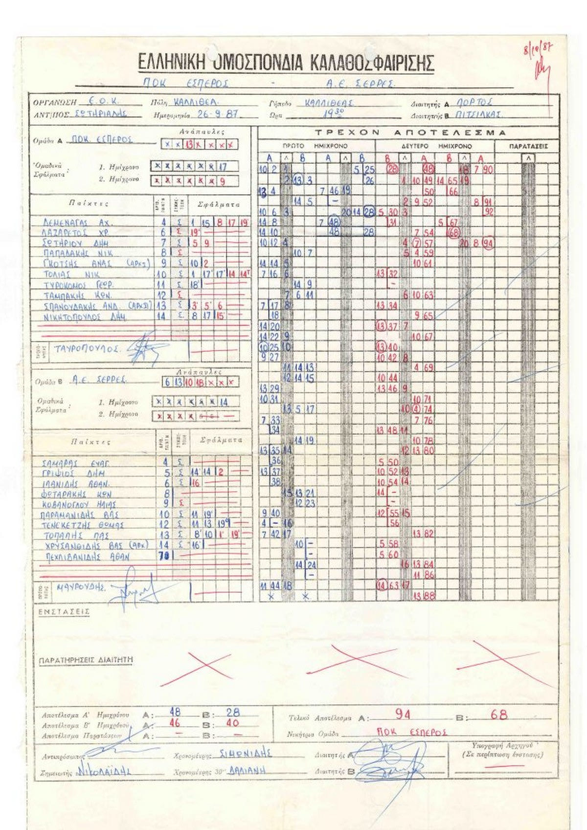 Τελευταίο στοιχείο από το ματς: Διαιτητές ήταν δύο μεγάλα ονόματα της εποχής, που έγραψαν ιστορία και αργότερα. Πρώτος ο Σάββας Λόρτος, επί σειρά ετών πρόεδρος της ΕΚΑΣΘ, και δεύτερος ο νεαρός τότε Νίκος Πιτσίλκας, που αργότερα έγινε διεθνής, σφύριξε τελικούς Ευρωμπάσκετ και Μουντομπάσκετ κι ανέλαβε για χρόνια διοικητικό ρόλο στη διαιτησία”.