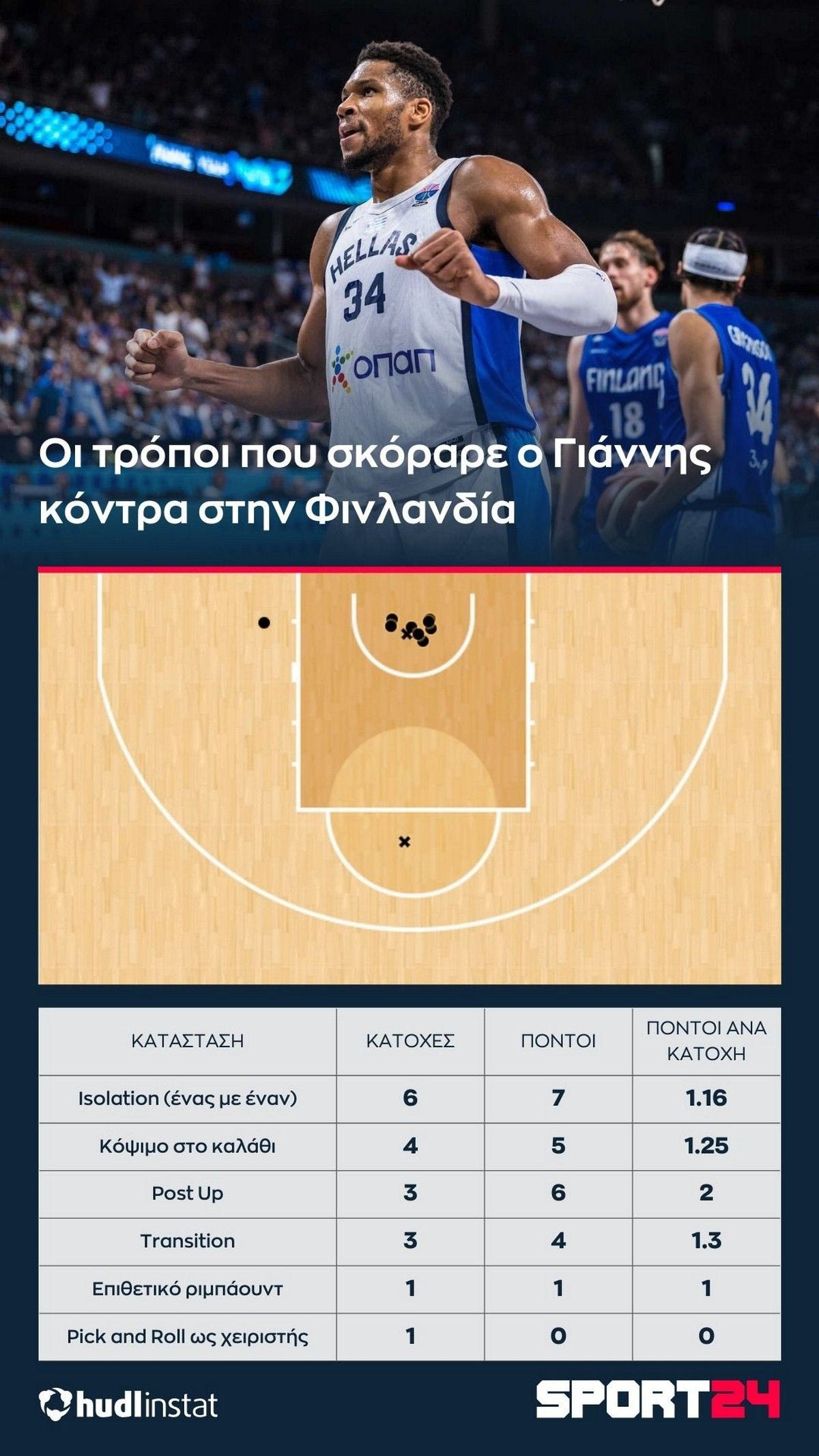 Ο Στέφανος Μακρής αναλύει με τη βοήθεια του Hudl Instat τη νίκη της Εθνικής ομάδας επί της Φινλανδίας. Τα προσωπικά καλάθια του Γιάννη Αντετοκούνμπο, τα σουτ του Ντόρσεϊ και η σπουδαία άμυνα του Παπανικολάου στον Μάρκανεν.