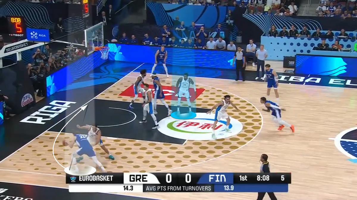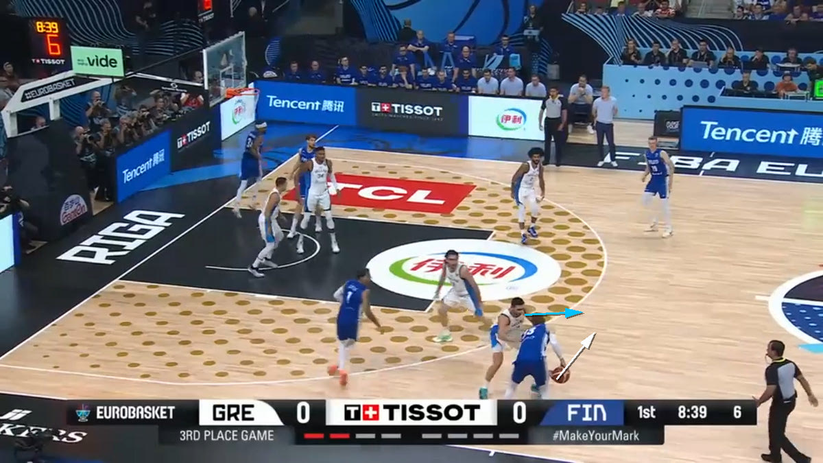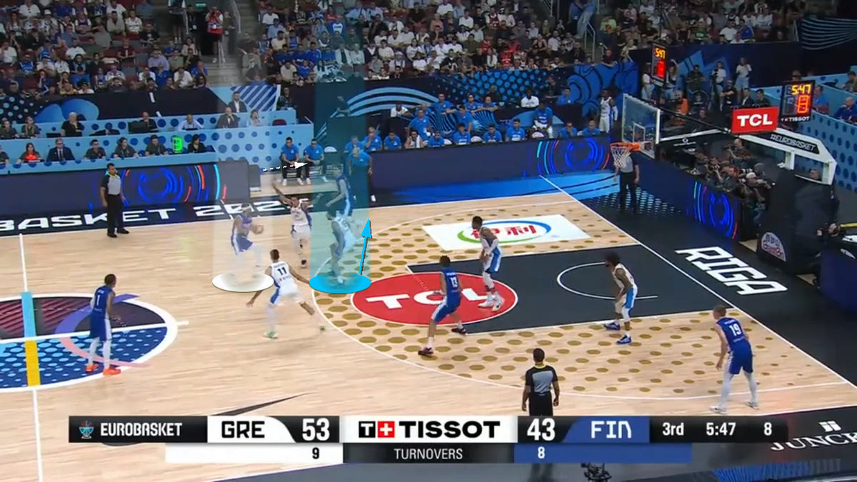 Ο Γκράντισον – που είναι σουτέρ – θέλει να παίξει Pick and Pop με τον Μάρκανεν. Ο Παπανικολάου αρχικά μένει ανάμεσα στον Γκράντισον και τον Μάρκανεν, για να δώσει χρόνο στον Σλούκα να περάσει από το σκριν.