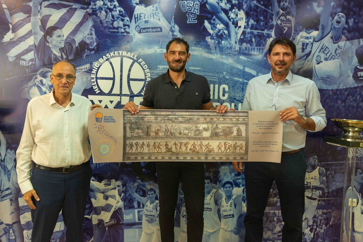 Το δώρο της ΕΟΚ προς τον παλαίμαχο μπασκετμπολίστα ήταν μία αφίσα στην οποία απεικονίζεται ένα ψηφιδωτό δάπεδο με παραστάσεις καλλιτεχνικών και αθλητικών αγώνων από την Πάτρα, στα τέλη του δεύτερου και τις αρχές του τρίτου αιώνα μ. Χ.