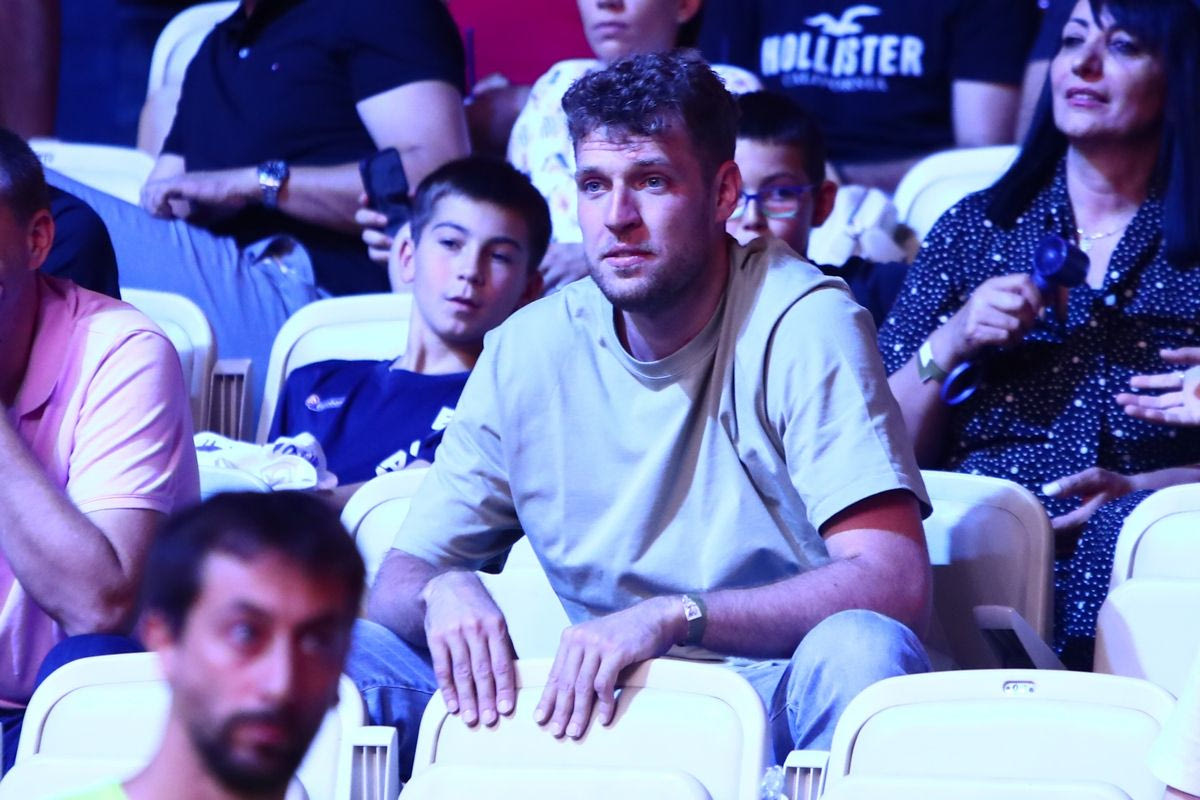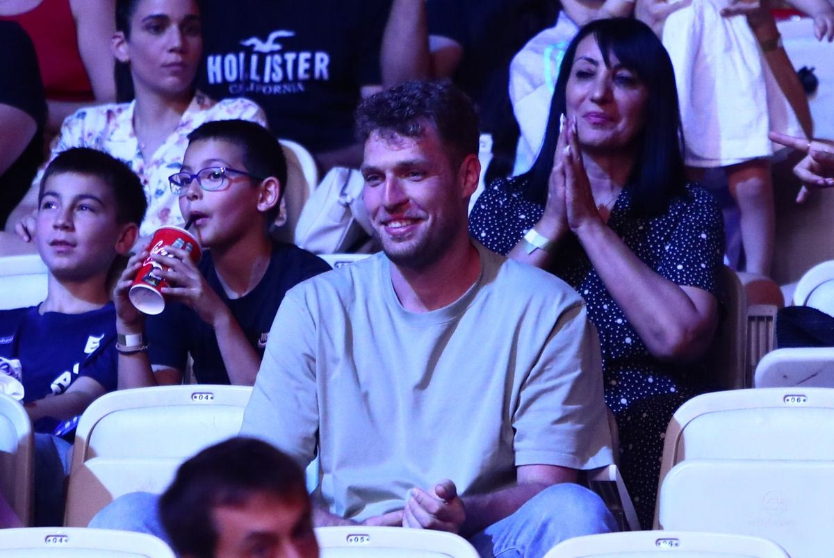 Ο Σάσα Βεζένκοβ παρευρέθηκε στο ΣΕΦ για να παρακολουθήσει την προσπάθεια της Εθνική Ελλάδας στο παιχνίδι με το Μαυροβούνιο για το τουρνουά "Ακρόπολις". Μια σειρά πιο πίσω κάθισαν τα παιδιά του Βασίλη Σπανούλη, ενώ ακόμα πιο πίσω ήταν η σύζυγος του ομοσπονδιακού τεχνικού.
