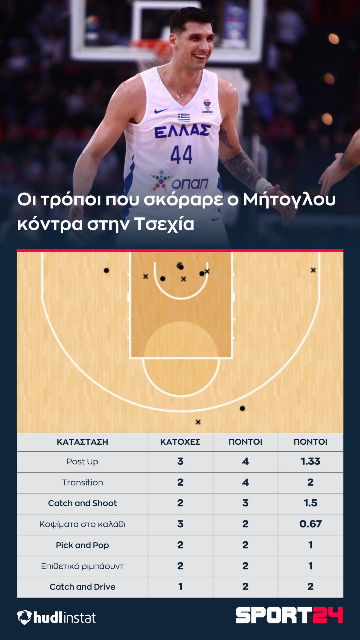 Ο Μήτογλου επιβεβαίωσε ότι είναι ένας από τους πιο φορμαρισμένους παίκτες στην Ευρώπη. Η Τσεχία δεν είχε παίκτη να τον μαρκάρει. Αν η Ελλάδα έβαζε μερικά σουτ περισσότερα, τότε ο Μήτογλου θα είχε και περισσότερους χώρους, να κάνει περισσότερες ζημιές.