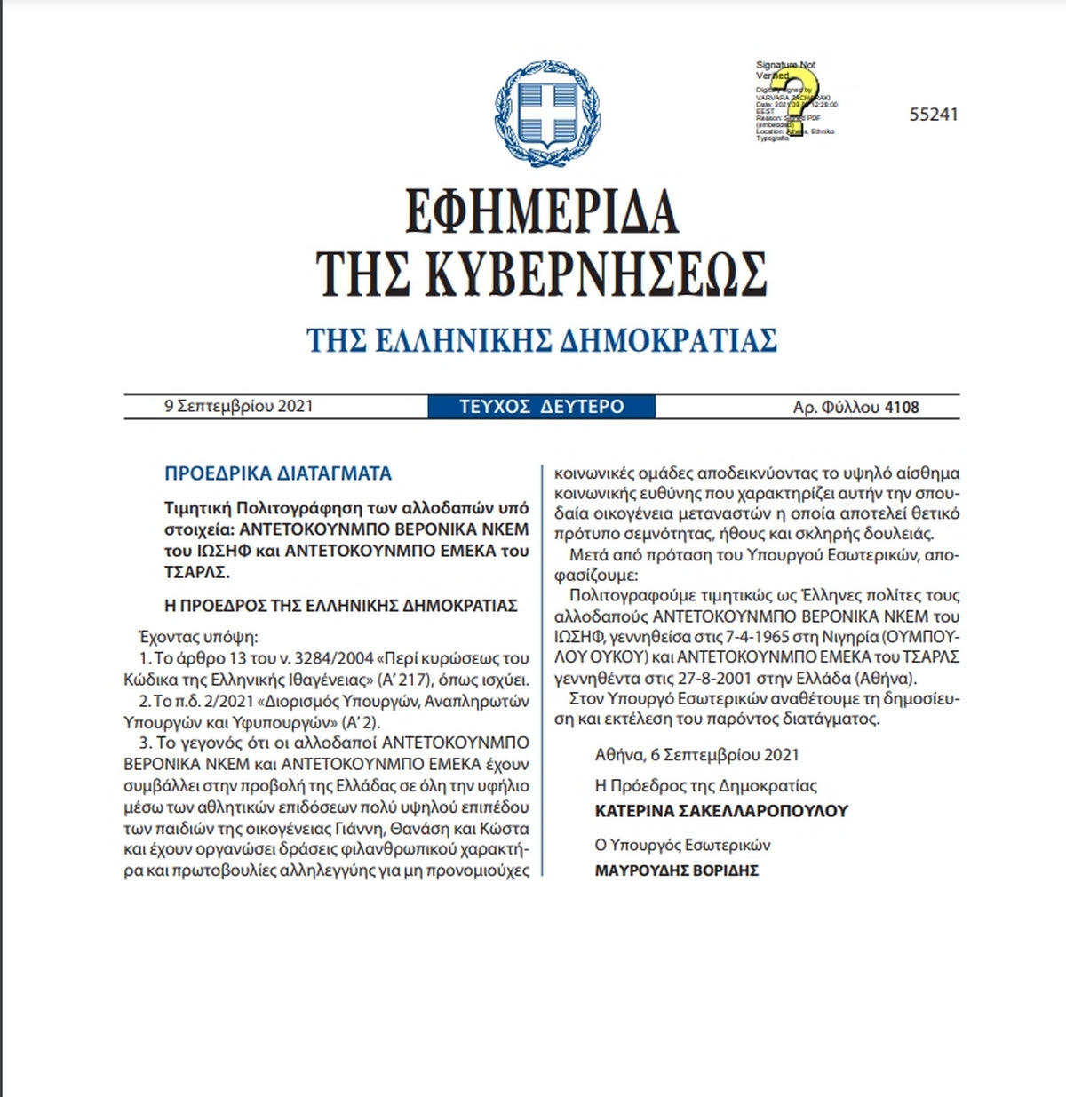 Έλληνες πολίτες είναι με κάθε επισημότητα οι Βερόνικα και Άλεξ Αντετοκούνμπο σύμφωνα με το Φύλλο Εφημερίδας της Κυβέρνησης που εκδόθηκε την Πέμπτη (9/9).