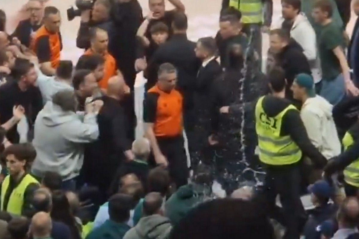Όπως φαίνεται στο video που δημοσίευσε το basketnews, κάποιοι πέταξαν και νερά προς τους διαιτητές της αναμέτρησης, οι οποίοι αναγκάστηκαν να αποχωρήσουν με συνοδεία προς την φυσούνα που οδηγεί στα αποδυτήρια του γηπέδου.