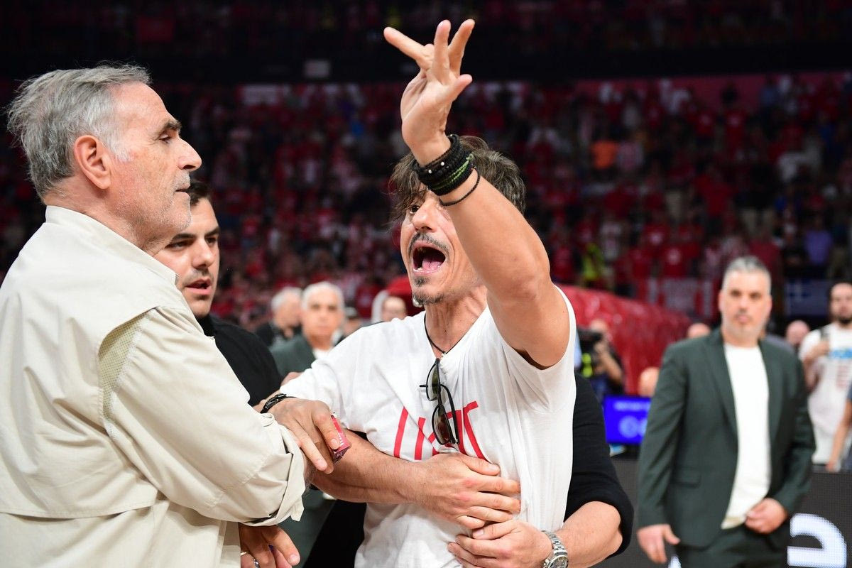 Ένταση στο ΣΕΦ δέκα λεπτά πριν από το τζάμπολ του Ολυμπιακός – Παναθηναϊκός, με τον Δημήτρη Γιαννακόπουλο να χειρονομεί πριν καθίσει στη θέση του.