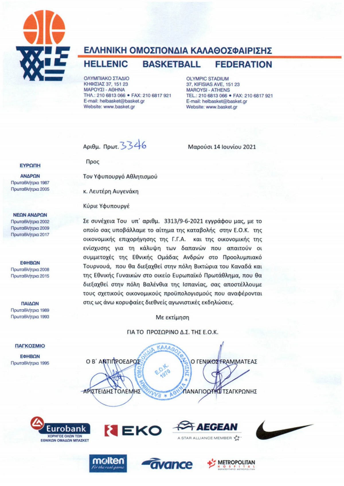 Κύριε Υφυπουργέ, με τα από 9 και 17 Ιουνίου 2021 έγγραφά μας, σας είχαμε υποβάλλει το αίτημα της οικονομικής ενίσχυσης του Υφυπουργείου Αθλητισμού για την κάλυψη των δαπανών που αφορούν τις συμμετοχές των εθνικών ομάδων ανδρών και γυναικών στις διεθνείς τους υποχρεώσεις, καθώς και των δαπανών που αφορούν τις διεθνείς διοργανώσεις των εθνικών μας ομάδων Νέων Ανδρών και Νεανίδων που διεξήχθηκαν με υποδειγματικό τρόπο στο Ηράκλειο Κρήτης, αιτήματα που έγιναν αποδεκτά από εσάς.