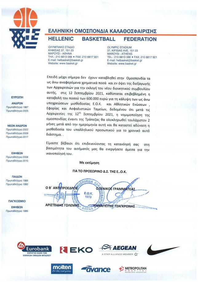 Τα έγγραφα που έστειλε στον Λευτέρη Αυγενάκη στις 25 Αυγούστου δημοσίευσε το απόγευμα της Τετάρτης (1/9) η προσωρινή διοίκηση της Ελληνικής Ομοσπονδίας Καλαθοσφαίρισης, έγγραφα με τα οποία ζητάει την καταβολή 600 χιλιάδων ευρώ για την πληρωμή των δαπανών των εθνικών ομάδων, των υπαλλήλων της αλλά και των Αθλητικών Ενώσεων, μαζί με τις υποχρεώσεις προς την Εφορία και τα Ασφαλιστικά Ταμεία.