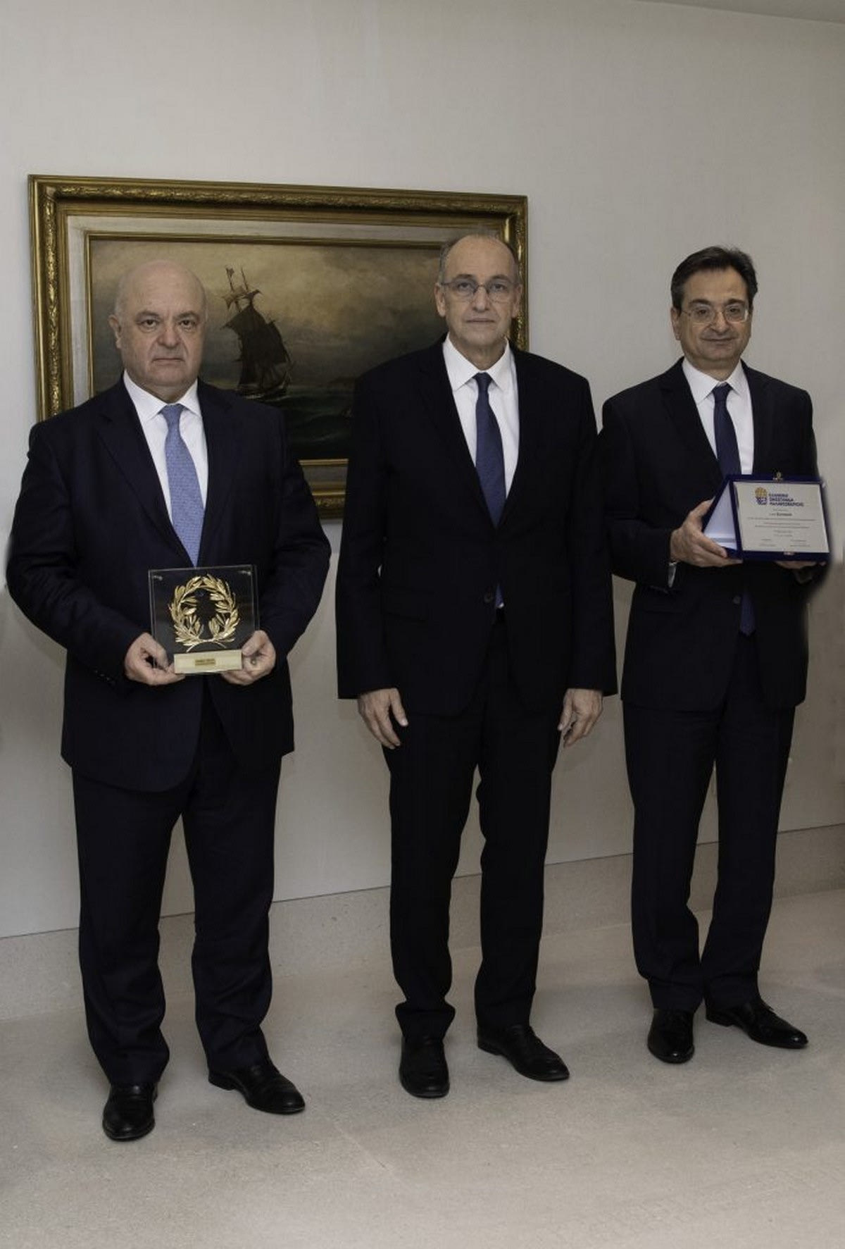 Ο Πρόεδρος του Διοικητικού Συμβουλίου της Eurobank κ. Γιώργος Ζανιάς (αριστερά) και ο διευθύνων σύμβουλος της Τράπεζας κ. Φωκίων Καραβίας (δεξιά) έχουν παραλάβει τα αναμνηστικά από τον πρόεδρο της ΕΟΚ κ. Βαγγέλη Λιόλιο.