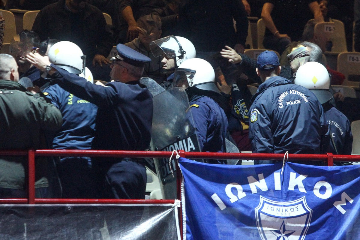 Χαμός στη Νίκαια, με οπαδούς της Προοδευτικής και του Ιωνικού να συγκρούονται περιμετρικά του κλειστού γηπέδου του Πλάτωνα.