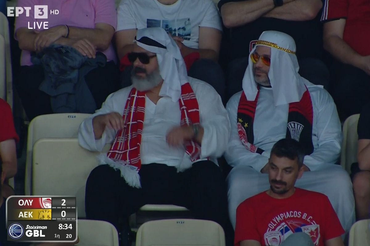 Σε ρυθμούς Άμπου Ντάμπι κινούνται ήδη οι οπαδοί του Ολυμπιακού. Δύο φίλαθλοι των ερυθρολεύκων ντύθηκαν μάλιστα Εμίρηδες και πήγαν στο ΣΕΦ το απόγευμα της Κυριακής (4/5) για να παρακολουθήσουν το Game 1 των ημιτελικών της Stoiximan GBL με την ΑΕΚ Betsson.