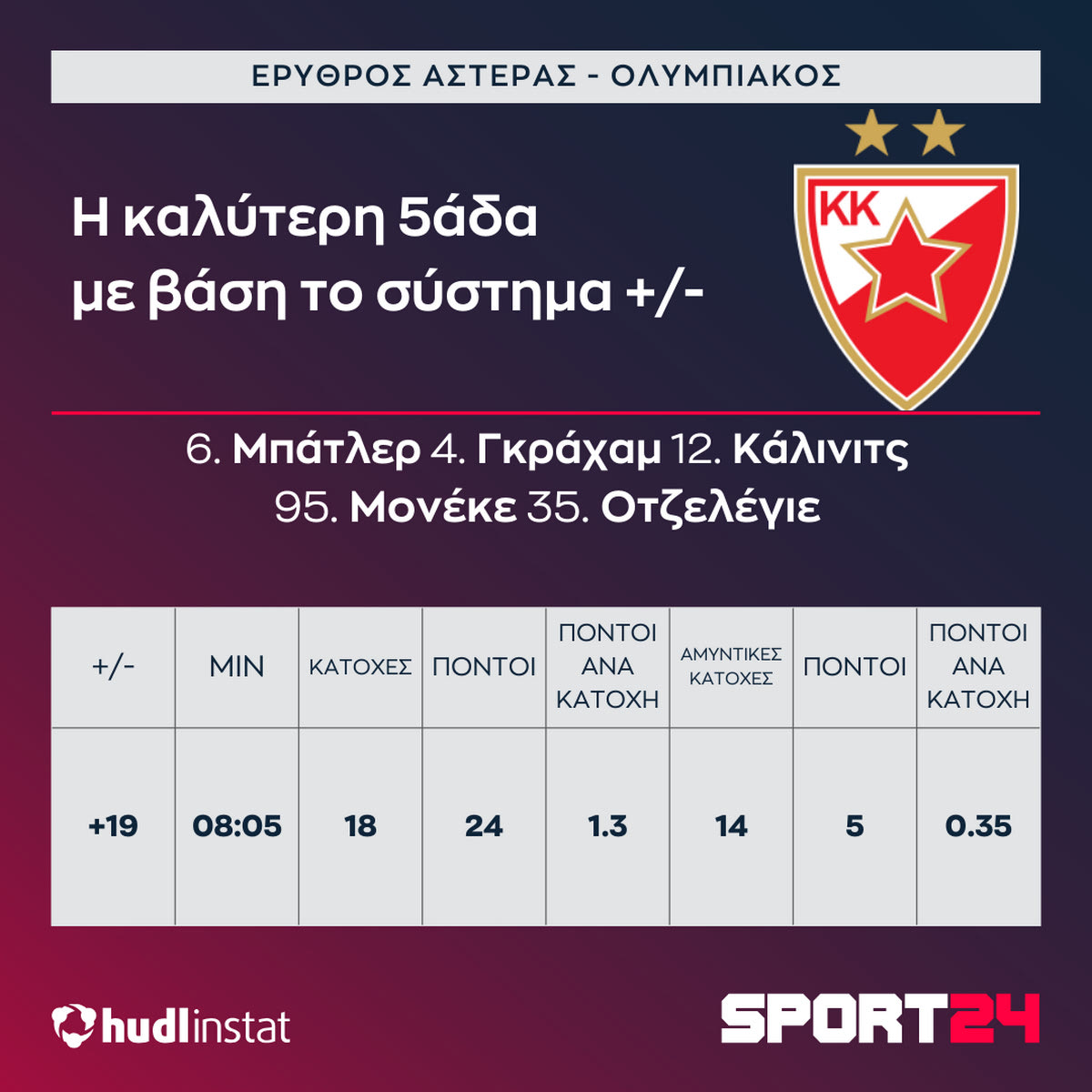 Ερυθρός Αστέρας – Ολυμπιακός: Το +19 της πεντάδας των Σέρβων που έφερε τούμπα το ματς, ο Μίλερ-ΜακΙντάιρ και η βραδιά του Βεζενκοβ που πήγε στράφι