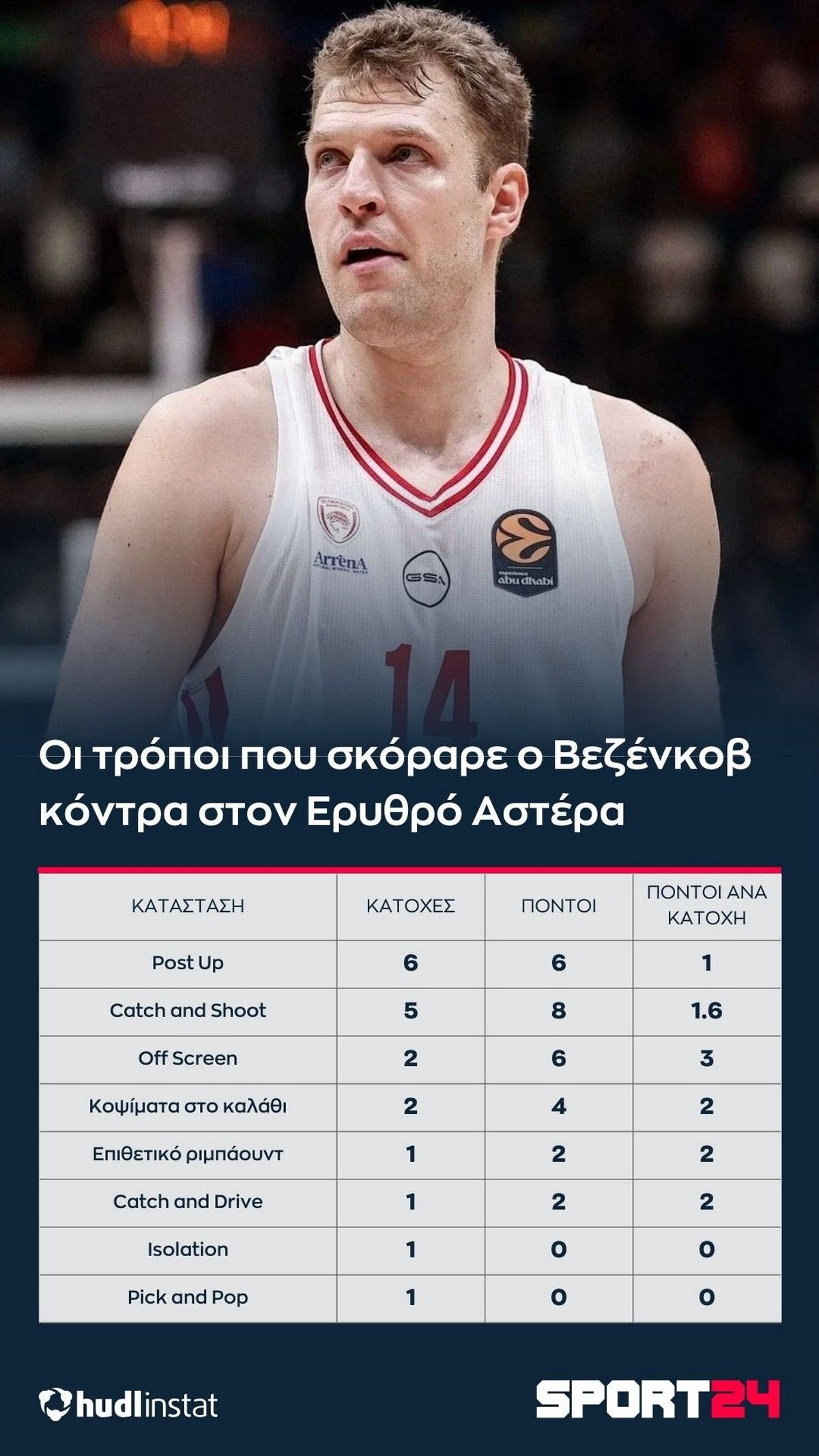 Ο Βεζένκοβ έκανε αυτό που έπρεπε στη μεγαλύτερη διάρκεια του ματς. Κουβάλησε τον Ολυμπιακό. Στα τελευταία λεπτά ήταν εμφανώς κουρασμένος, με τον Κάλινιτς να παίζει ρόλο σε αυτό. Το παιχνίδι πέρασε στα χέρια των γκαρντ, ο Βεζένκοβ δεν πήρε επιθέσεις με τις προϋποθέσεις που ήθελε και ο Ολυμπιακός ηττήθηκε.